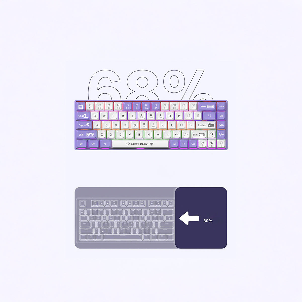 Formato reducido con aproximadamente 68 teclas, ideal para setups minimalistas o escritorios con poco espacio. Mantiene las funciones esenciales sin sacrificar comodidad ni accesos rápidos.