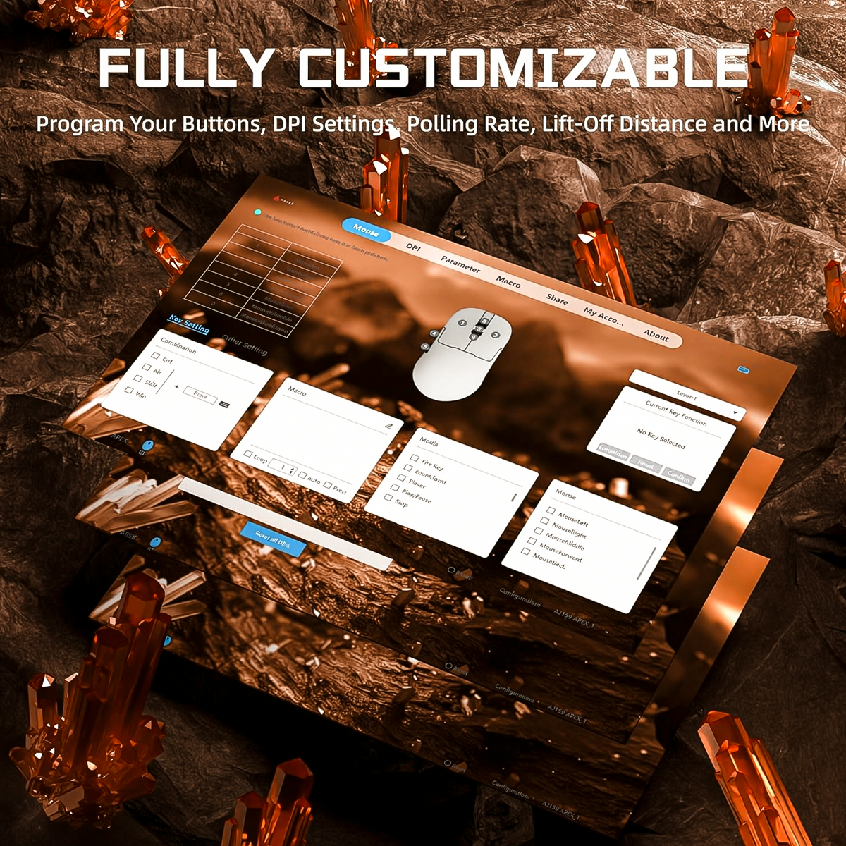 Controla cada detalle con el software de personalización integrado, que te permite ajustar tus botones, sensibilidad (DPI), tasa de sondeo (Polling Rate), distancia de levantamiento (Lift-off Distance) y crear macros a medida.