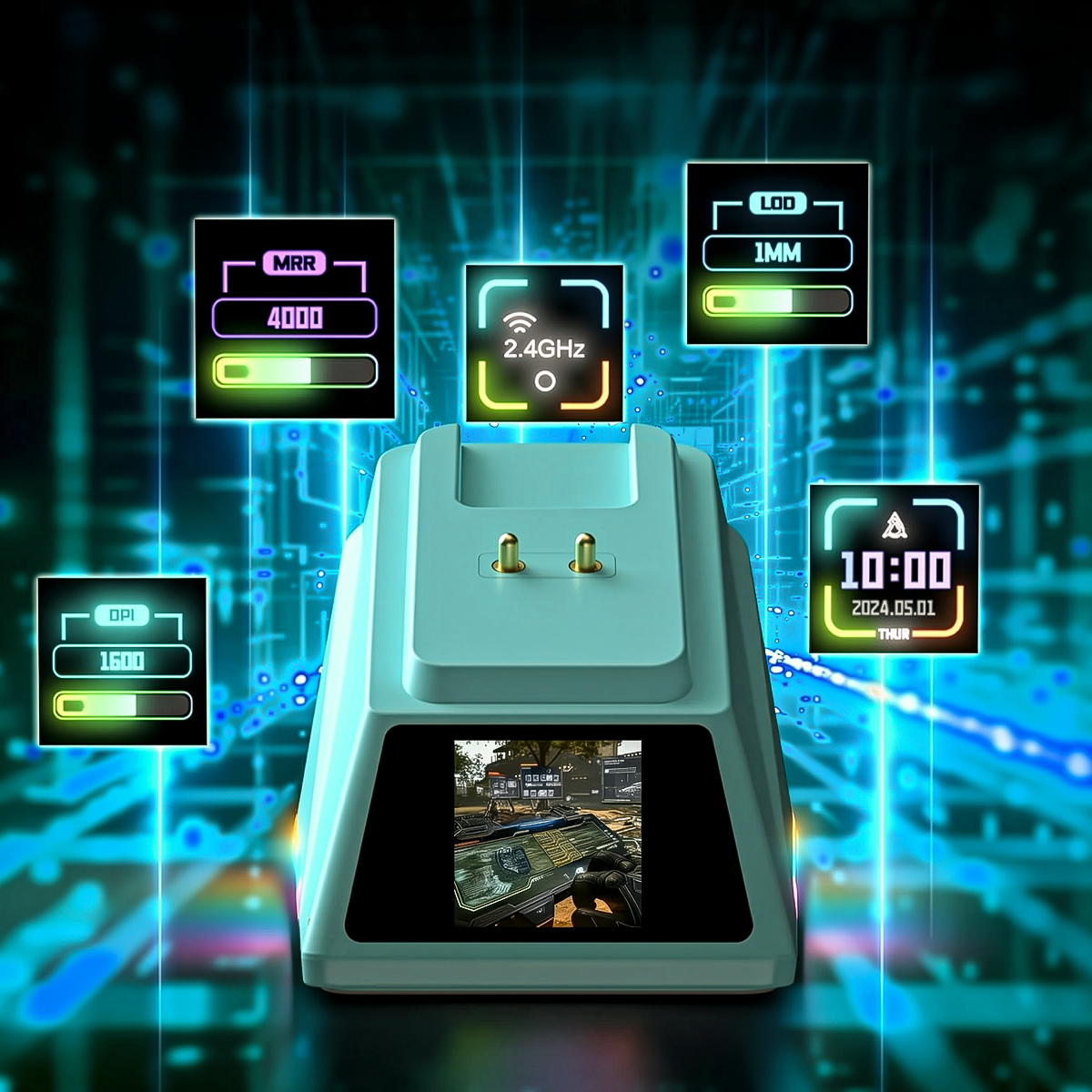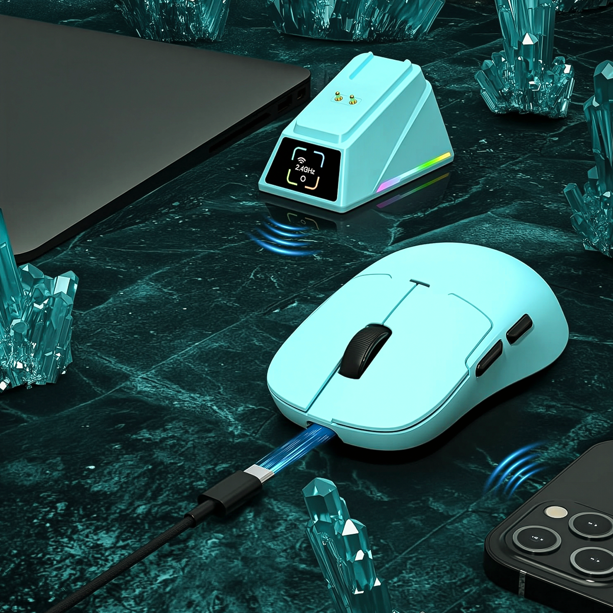 La base de carga magnética con iluminación RGB no solo mantiene tu ratón siempre listo, sino que además realza tu setup con un toque visual impresionante. Coloca el ratón y se cargará automáticamente, sin necesidad de cables adicionales.