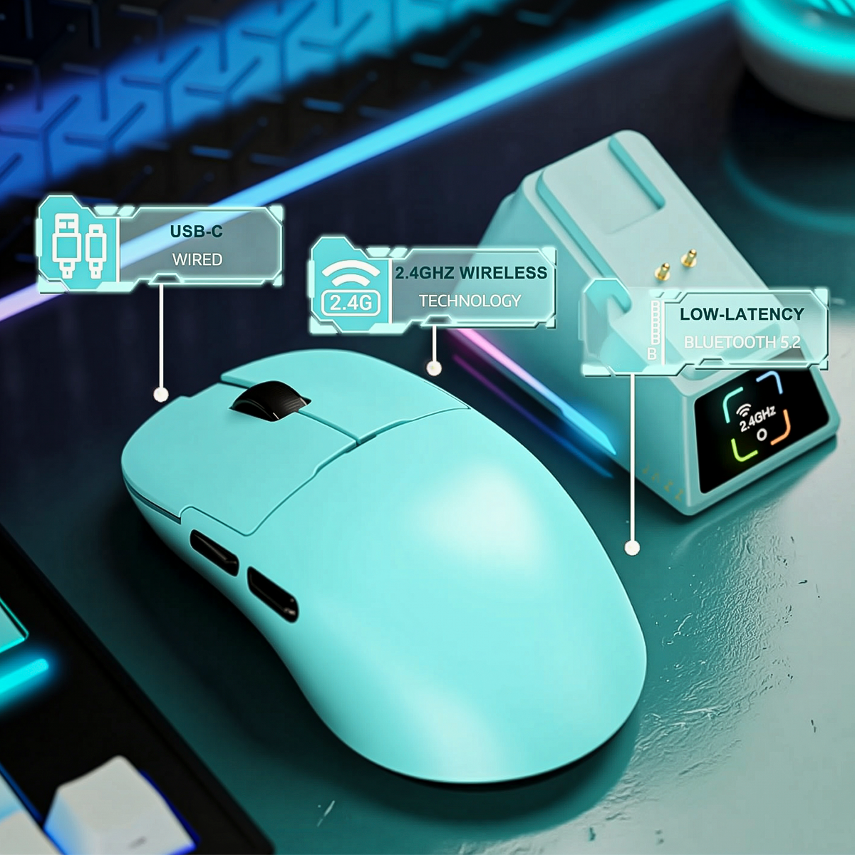 Disfruta de la libertad del modo inalámbrico 2.4 GHz o conecta el cable USB-C para un rendimiento continuo mientras se carga. Cambia fácilmente entre ambos modos y experimenta una conexión rápida, estable y sin interrupciones.